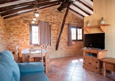 Casa distribuida en dos plantas, Salón, comedor, cocinas amplios, con hogar de leña y aseo en la primera planta. Habitación de matrimonio con TV, armario y baño completo con ducha, Habitación con dos camas individuales, TV y baño completo con ducha. Ámplia terraza a la entrada del apartamento.